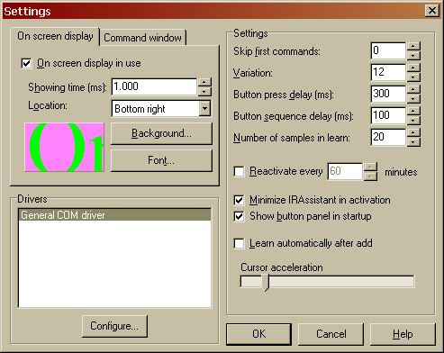 Um die Fernbedienung des PCs zu ermöglichen benötigen sie das Programm IRAssistant und den dazugehörigen General Com Driver, die beide zum kostenlosen download unter:: http://www.irassistant.com zur Verfügung stehen. Um Das Programm und den General Com Driver zu installieren, folgen sie bitte der jeweiligen Anleitung. Nach dem Starten des IRAssistant und auswählen des Punktes Settings im Menü File sehen sie folgendes Bild:
