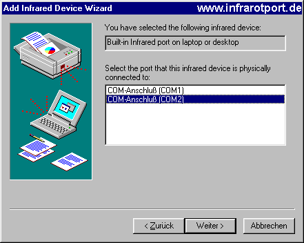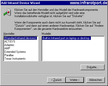 Mit "Weiter" zur folgenden Seite. Hier bei Hersteller: "(Standard infrared devices)" und bei Modelle: "Built-in Infrared port on laptop or desktop" einstellen: