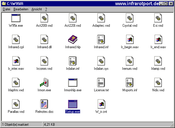 Für die Infrarotport-Installation unter Windows 95 (erste Ausgabe) mußt Du zunächst den Microsoft-Treiber downloaden: irda2.0.zip Alle Dateien entpacken. Dann aus den entpackten Dateien Setup.EXE ausführen.